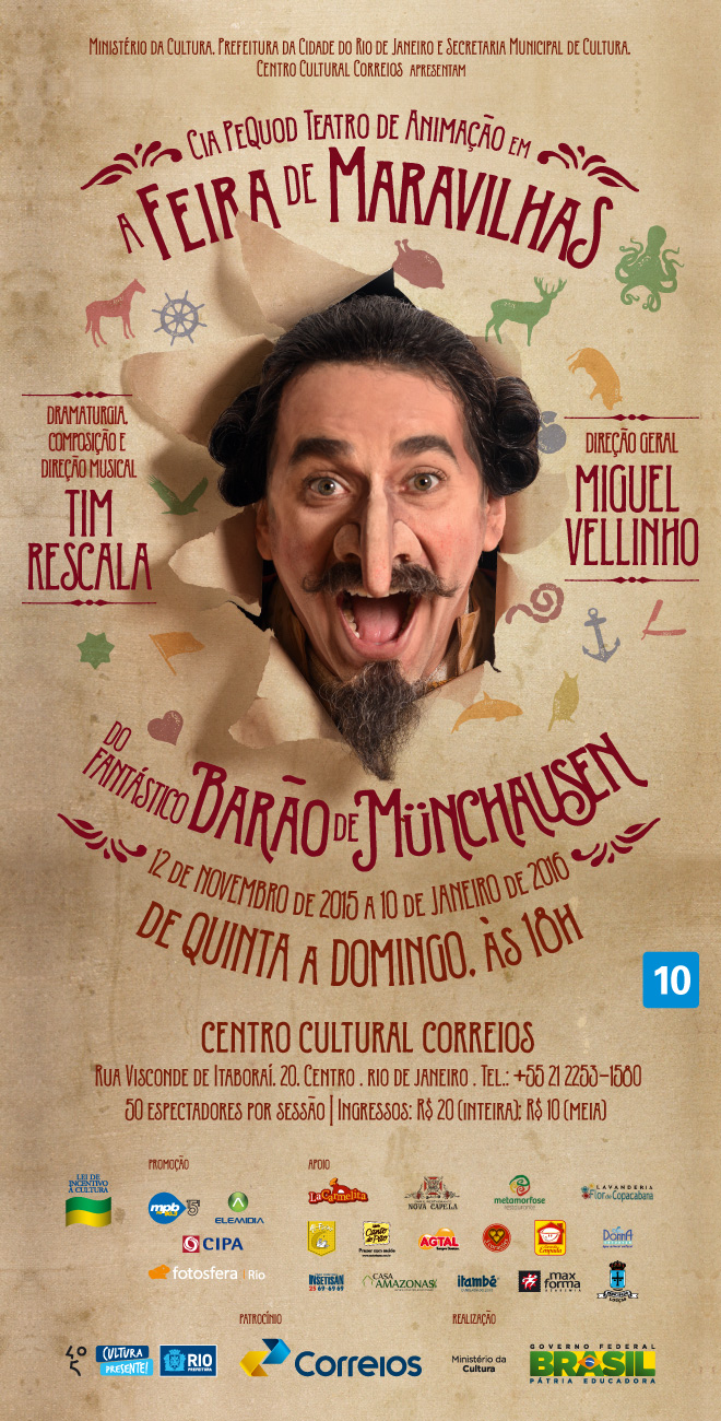 O espetáculo A feira de maravilhas do Barão de Munchausen estreou no dia 13 no Centro Cultural dos Correios. A peça, que tem texto, música e direção musical de Tim Rescala, é uma montagem da Cia Pequod, com direção de Miguel Velhinho.